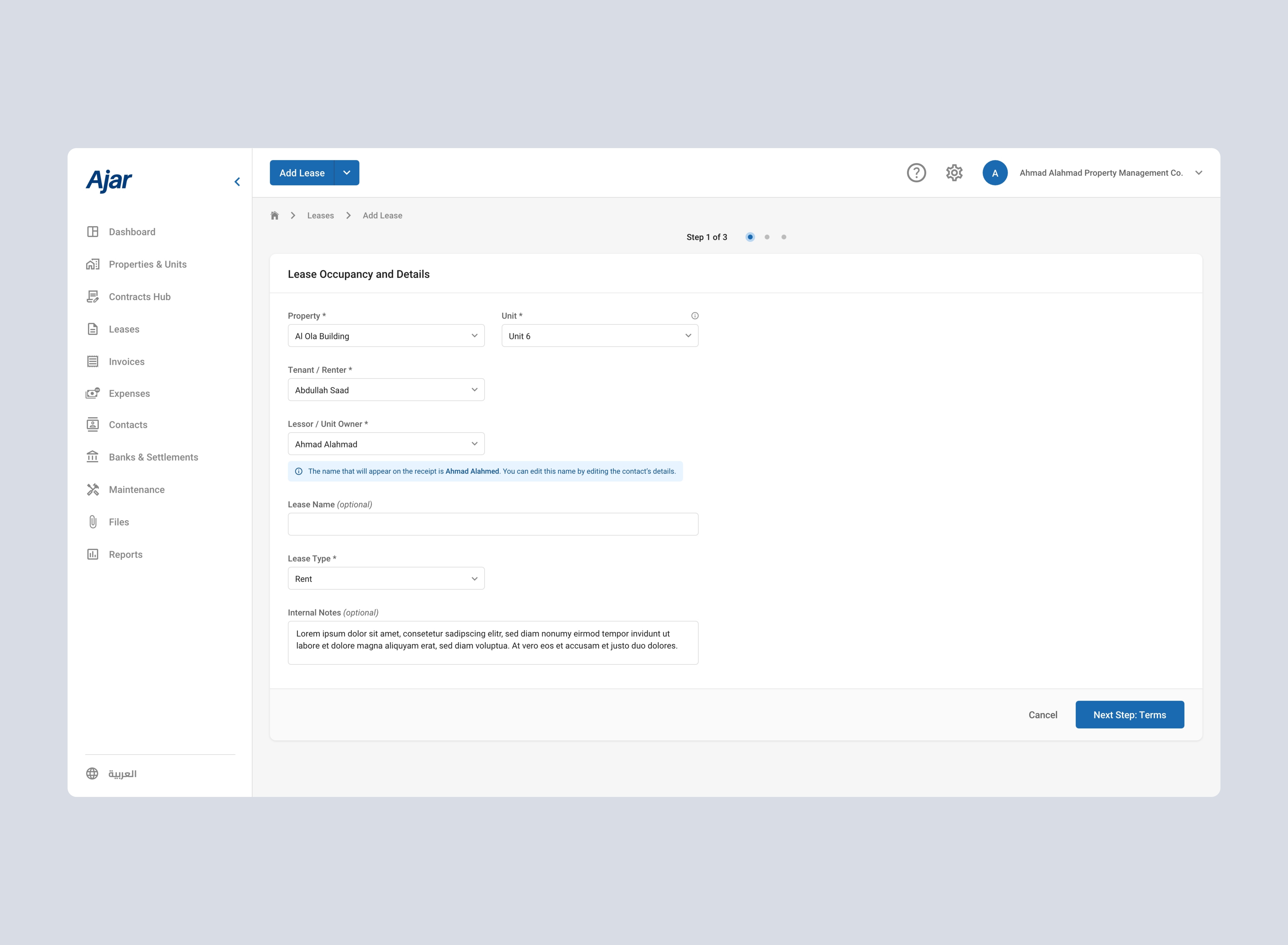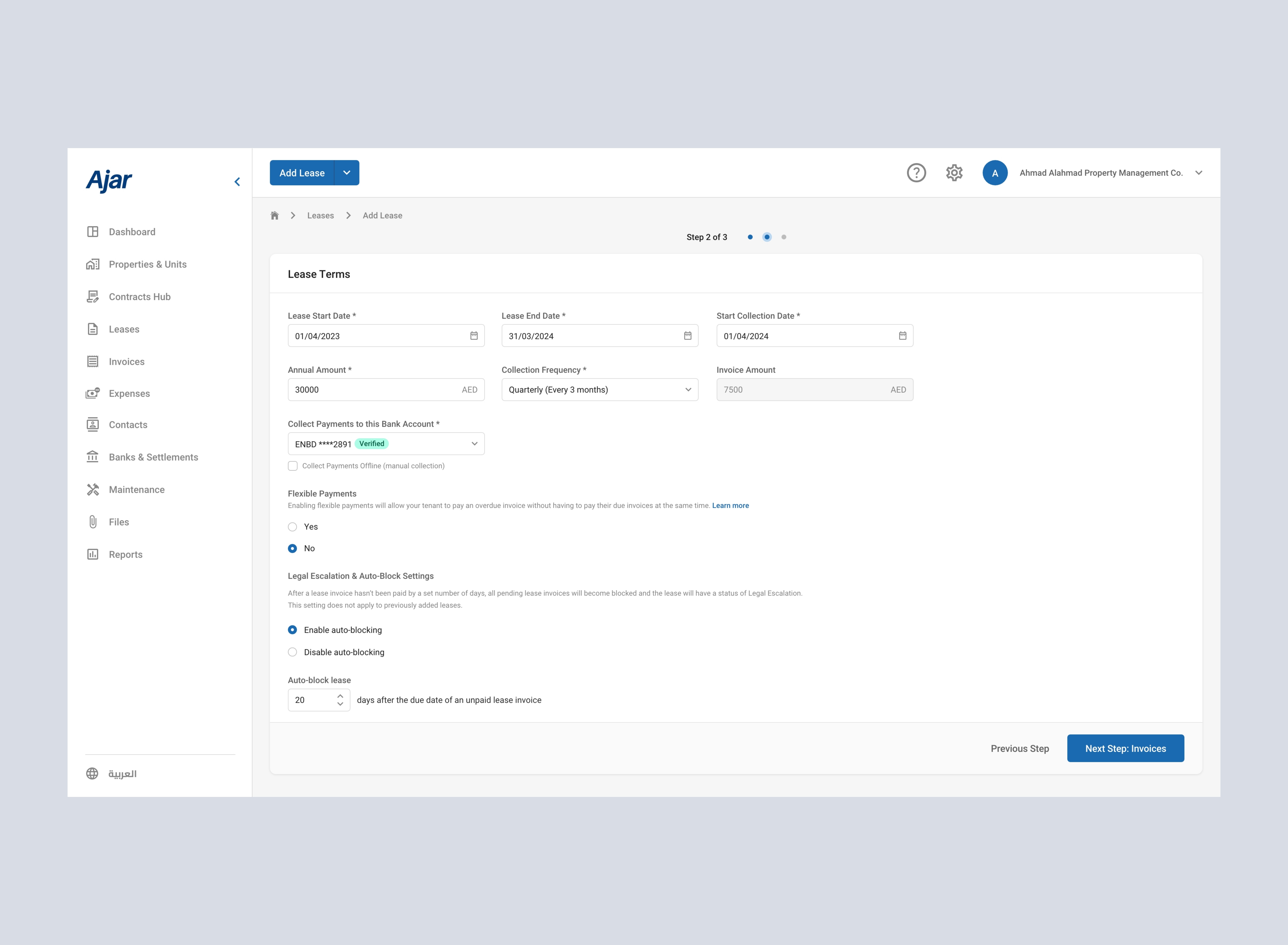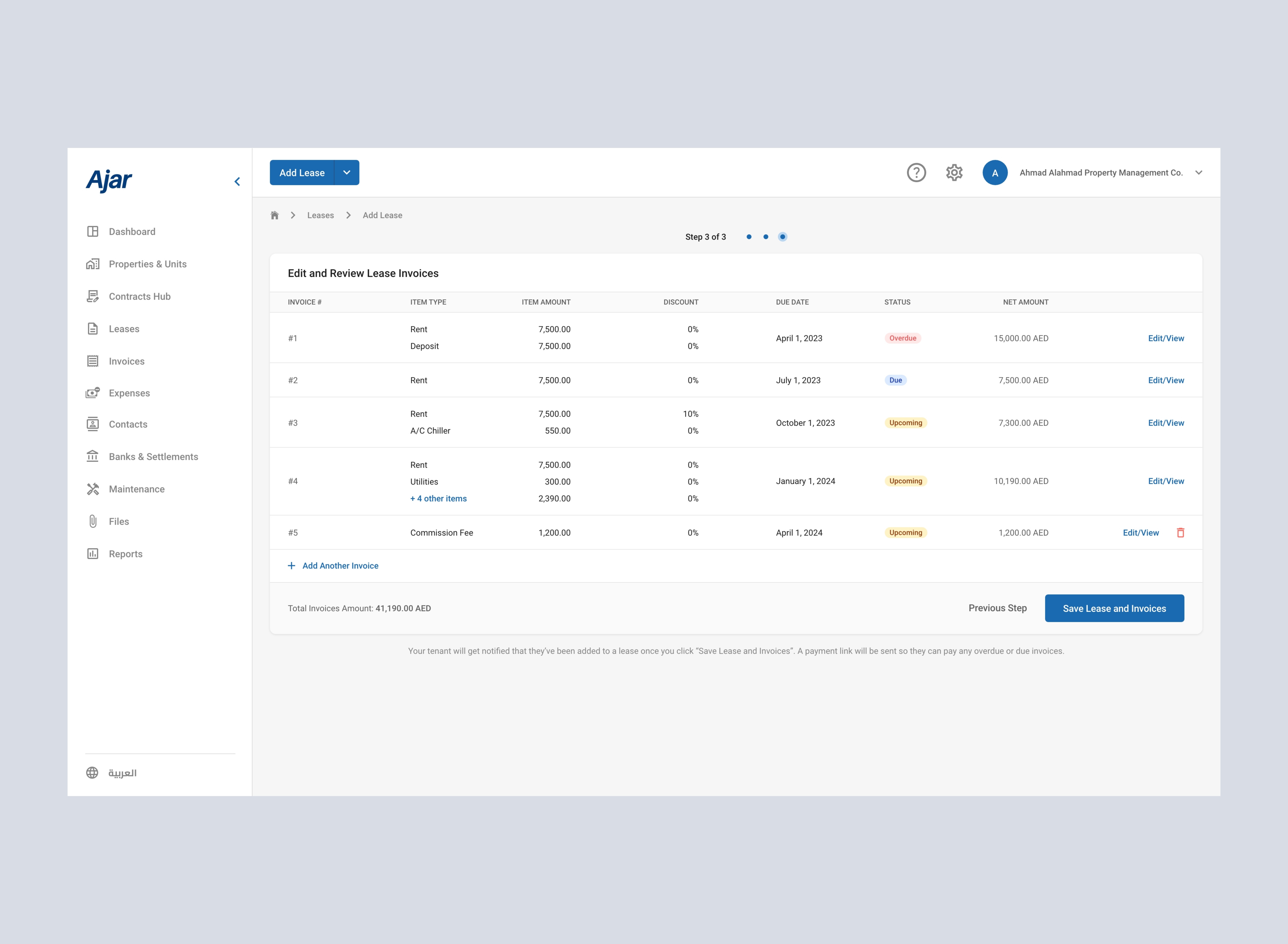 Ajar is property management and rent collection web application. One of its core modules is the Leases module, which allows users to create leases and generate invoices through a streamlined multi-step flow. This design enables property managers to customize invoice items, apply discounts, set lease terms, and easily extend leases or add one-time invoices — delivering a fast, flexible, and efficient experience.